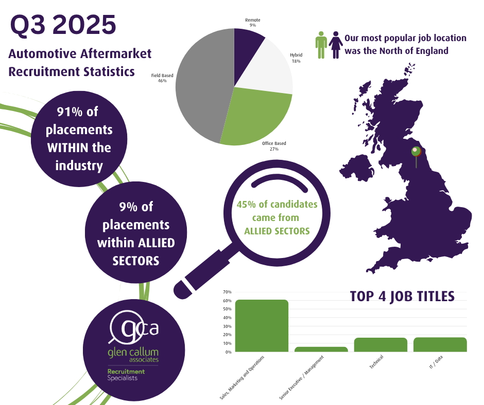 Glen Callum Associates (GCA), the specialist recruitment agency serving the automotive aftermarket, has released its Q3 2025 recruitment report, revealing a market where field-based roles remain dominant, northern locations are proving most popular, and businesses continue to balance industry experience with fresh talent from allied sectors.