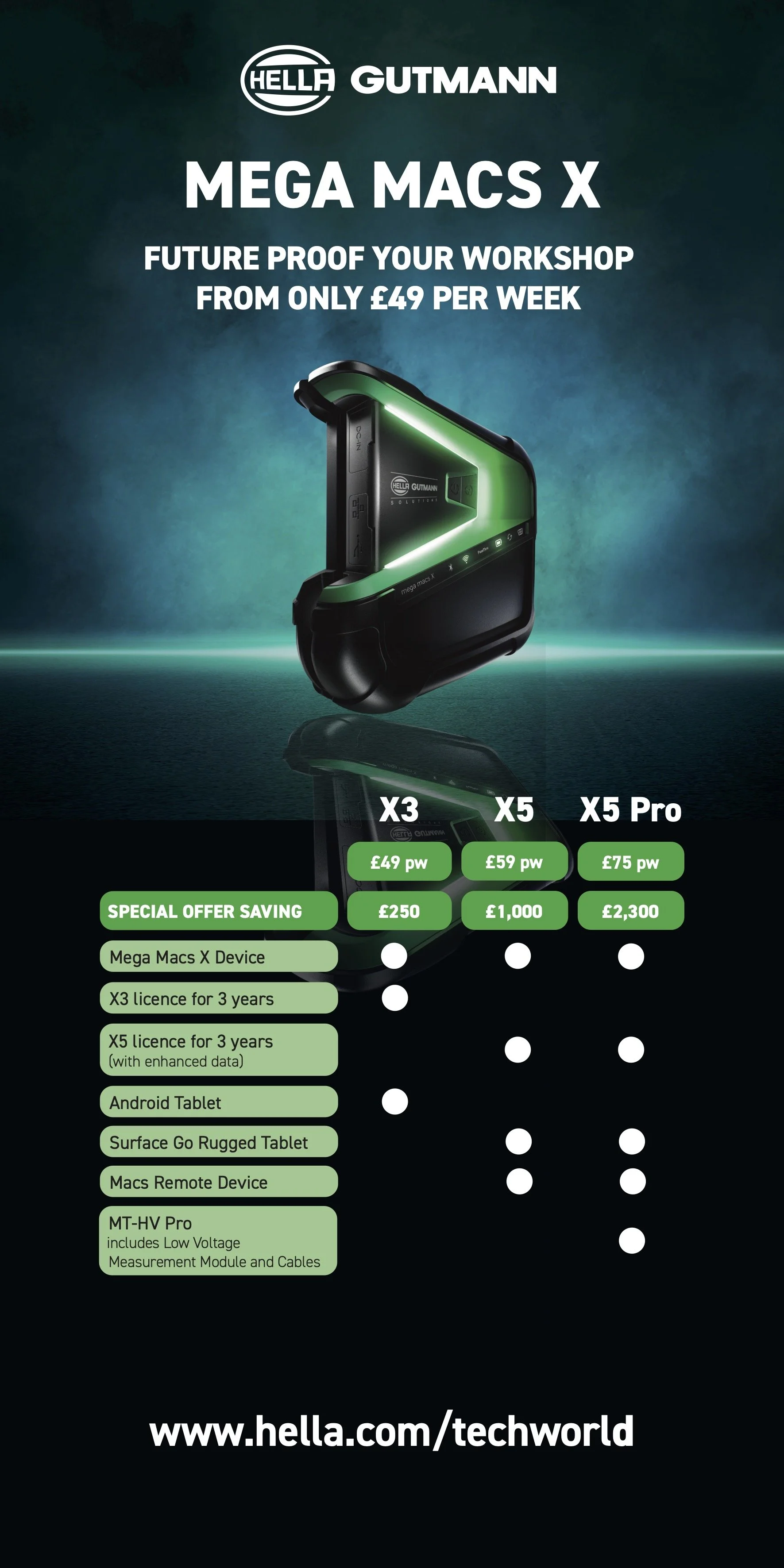 “The initial scheme is a three-year option offering that can be applied to our X3, X5 and X5 Pro licences. Starting at £49 per week workshops will receive a mega macs X with an X3 data package, as well as an Android tablet. Increase to £59 per week and the mega macs X will come with X5 enhanced data, a Surface Go rugged tablet plus a macsRemote. However, the ultimate option, at only £75 per week, also includes a MT-HV Pro high and low voltage measure module, which allows workshops to safely discharge high voltage systems and work on hybrid and electric vehicles! And each offer also includes the licence renewal for the full three-year period.”